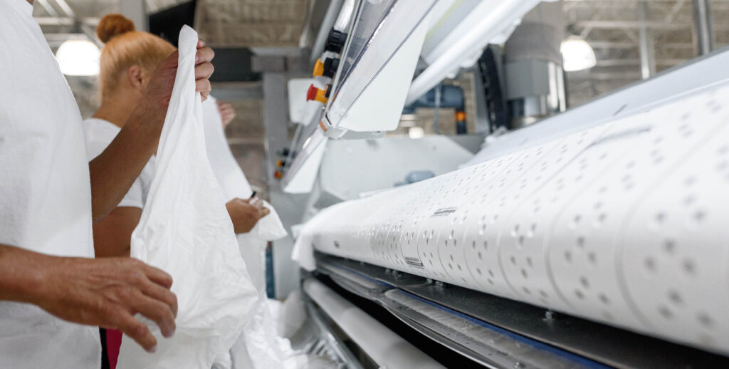 Designed for medium and high-volume laundries where space is tight, the Compact Pro Ironing System not only saves space but also feeds, irons, folds, stacks and accumulates linens at speeds up to 50 feet per minute. It offers flexibility, handling a variety of items on up to four lanes, with 1 lane for sheets, 2 lanes for table linens and 4 lanes for small items (when equipped with the accumulator). The Compact Pro comes in 24″ and 32″ diameters with a 130″ finishing width and works with natural gas or liquid propane (LP) heat.