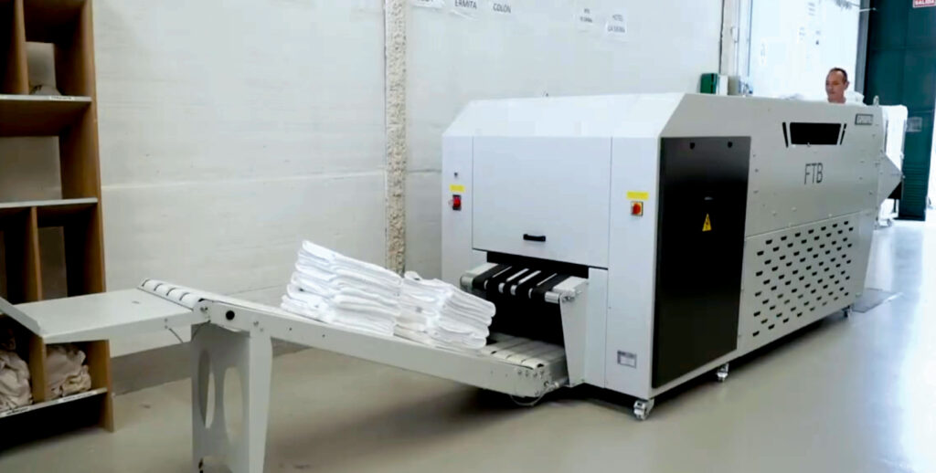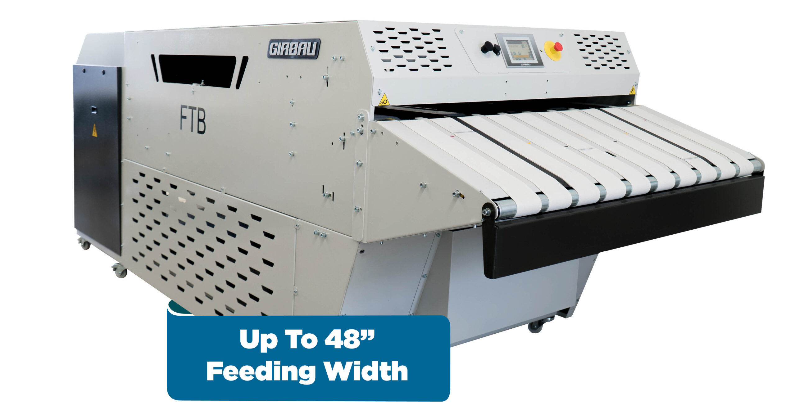 The FTB is fed manually on an independent feed table, allowing operators to feed linen without affecting production. Integrated conveyors support continuous operation, and the system can be programmed to stop between units for improved control and handling of items.