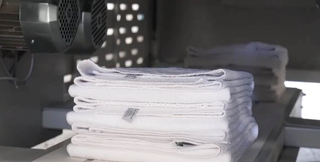 Fold towels, linens, and Fold towels, linens, and small dry goods efficiently using an adjustable air-jet system, with automatic stacking of up to 900 pieces per hour. Compact and programmable, this machine adapts to your facility’s workflow and boosts productivity.