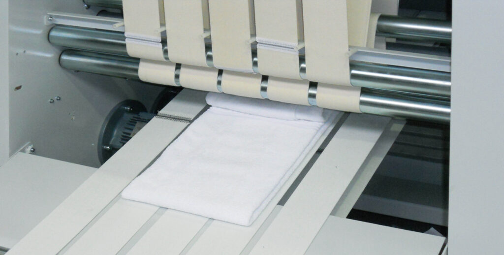 Production rates reach up to 900 pieces per hour, with actual throughput influenced by linen type, fold configuration and operator feeding efficiency.